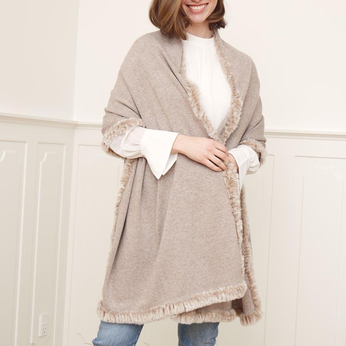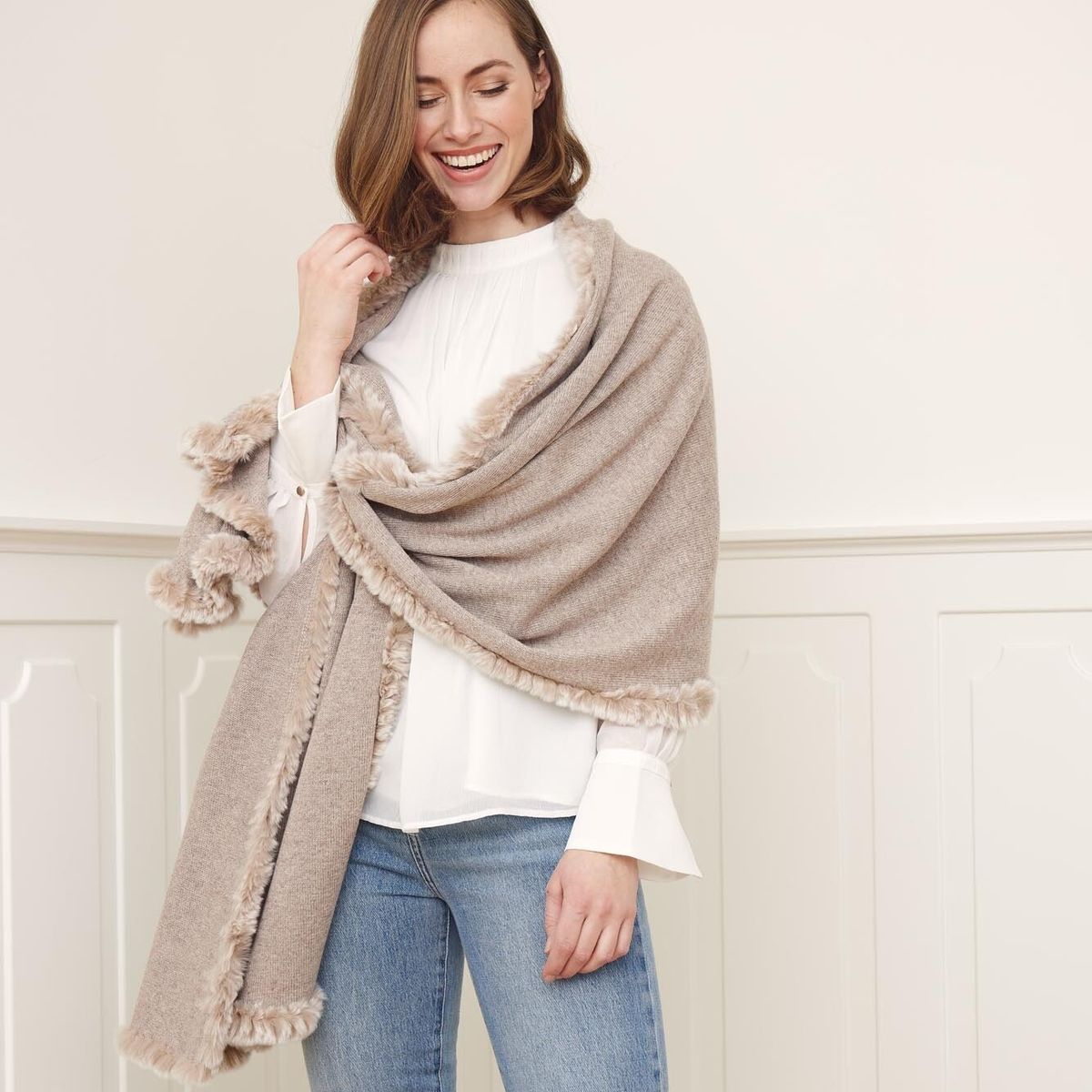 Ontdek Scarlet, een luxueuze sjaal gemaakt van hoogwaardige schapenwol met een elegant lint van konijnenbont langs de zoom. Deze sjaal ideaal om onder een jas te dragen of als stijlvol accessoire binnenshuis. Voeg een vleugje luxe en warmte toe aan je outfit met Scarlet!